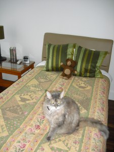 I love my English Garden Quilt. I bought the fabric from a lovely little shop in London approximately 3 years ago. I just loved the material. It reminded me so much of a wonderful english garden. I loved the colors, and the plethora of flowers all over it! I finished the quilt top while we were in Moscow, and finished machine quilting it once we moved to San Francisco. It is one of my favorites, and apparently, it is one of my cat Thunder’s favorites!