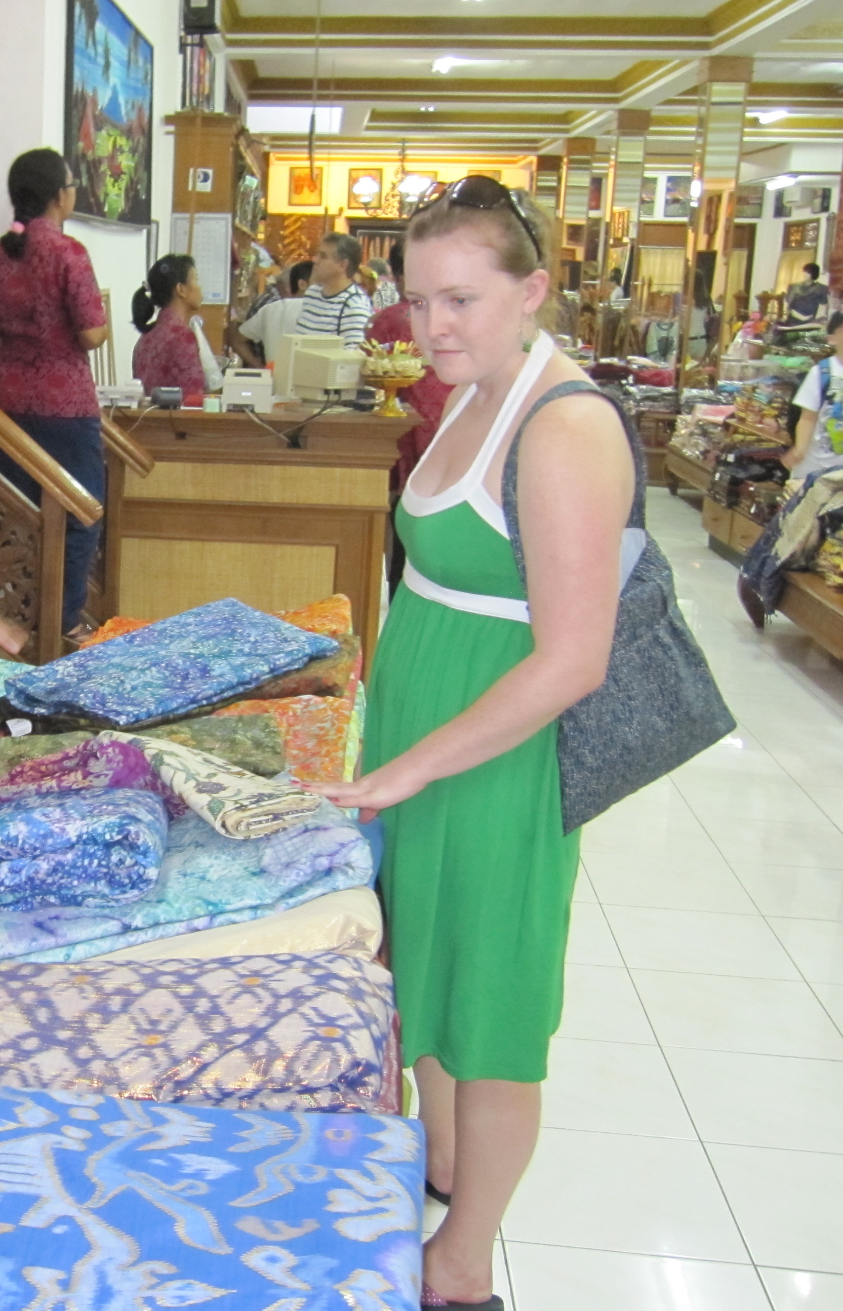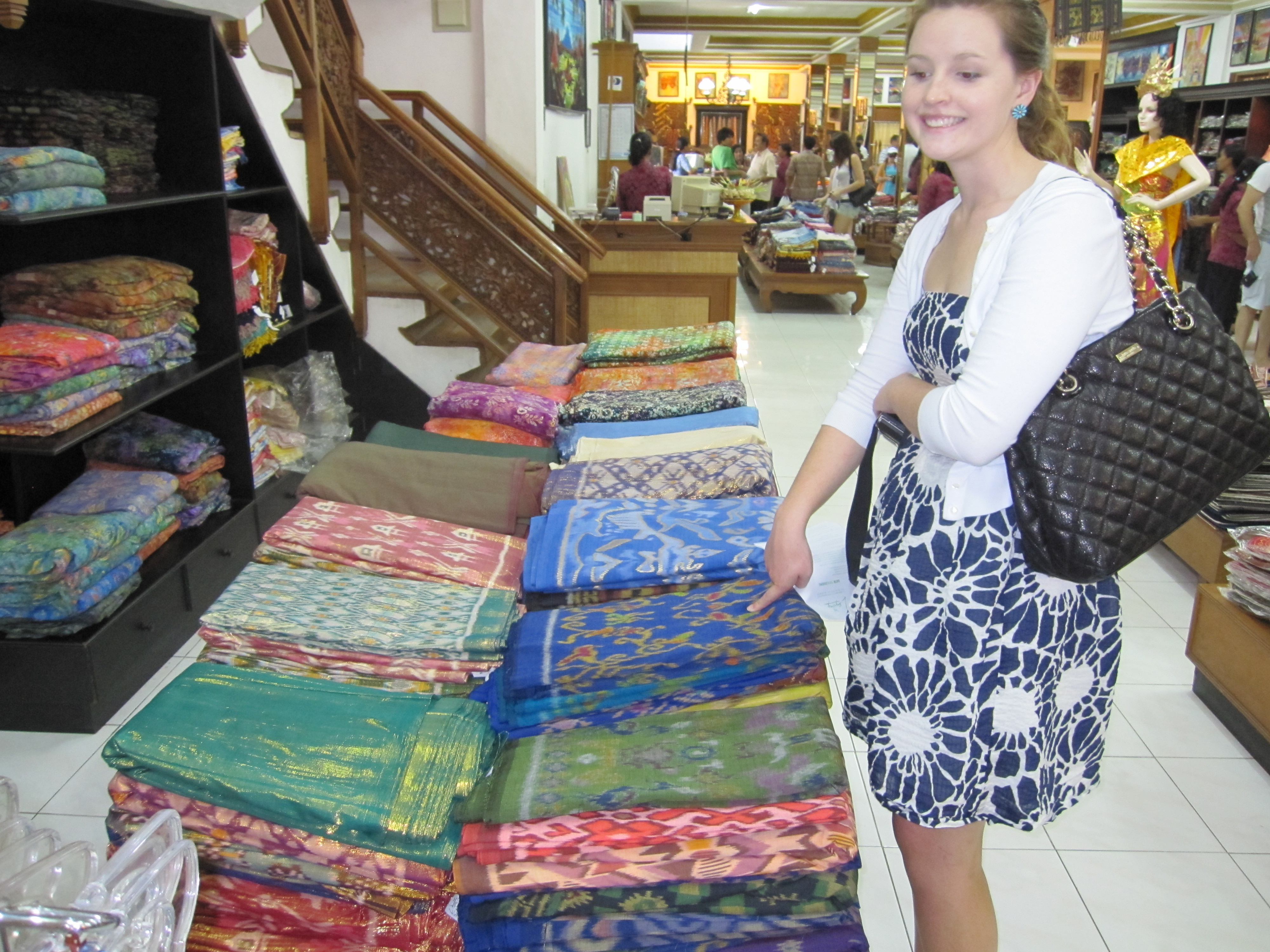 My daughters, Lauren and Sarah, are looking at the various batiks for sale. These fabrics are sold by the meter. Lauren picked up 6 meters to make a quilt with to memorialize her trip!