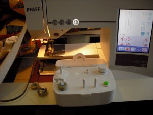 No, I am not talking about the venomous, pit-viper, I am referring to the handy bobbin winder that is a happy little addition to my studio space. I have never been thrilled with the way this Pfaff machine winds bobbins (to be fair, I have two other Pfaff’s that wind bobbins superbly). I wanted something where I could just wind a bunch of bobbins at the start of a project, and just have them at the ready. I had been eyeing up the Sidewinder. I told my family that I really wanted one for Christmas. But, like my usual, impetuous self, I bought it while shopping a fabulous Christmas sale at one of my quilt shops in the Louisville area.