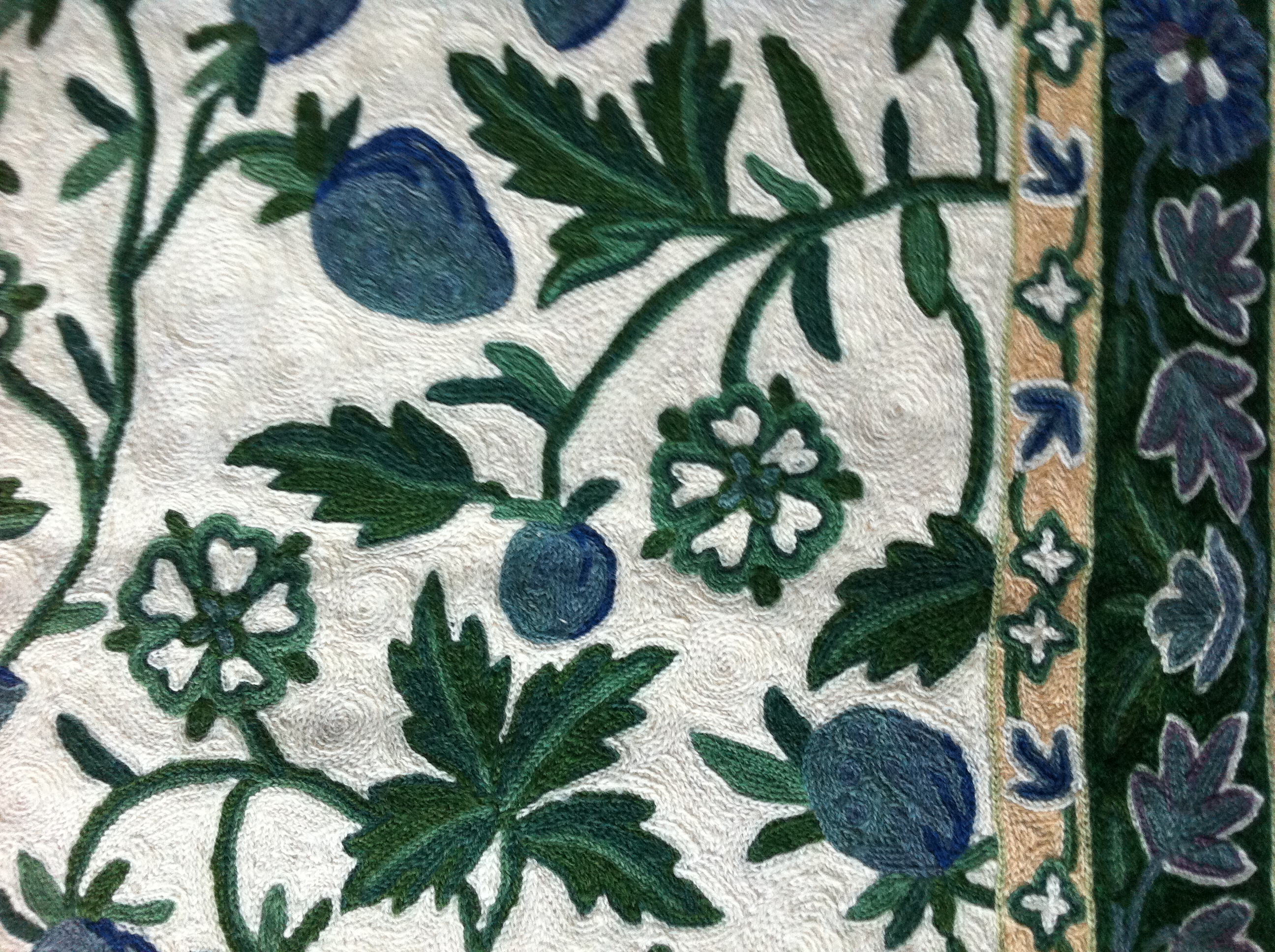 I ended up buying this fabulous chainstitch rug from Kashmir. These are handmade by men from the region. It is being used in “the blue room.” It is the bedroom for my oldest daughter Lauren, and guests. The walls are blue, and everything in the room is basically, black, white, and blue.