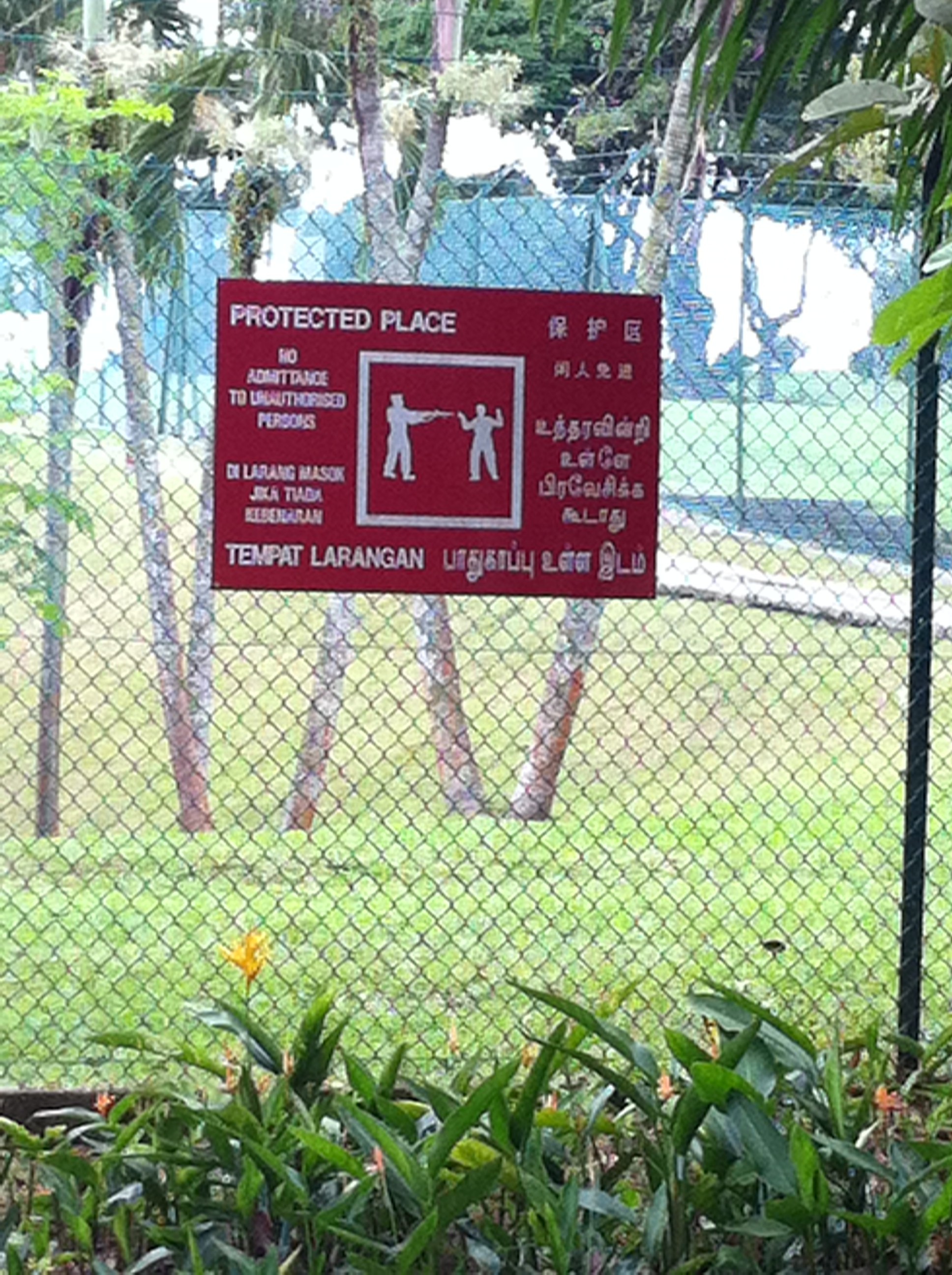 My husband and I were golfing this past weekend, at a little executive 9-hole course here in Singapore. We hit the 9th-hole, and as we were walking to the green, I noticed this big chain link fence with barbwire at the top. It was a pumping station behind the fence, and these signs were posted all around. I am guessing that you certainly won’t hunt for your ball if it goes behind the fence. I’m not going anywhere where they threaten you with guns if you enter the ‘protected place.’ The monkeys didn’t seem to be too worried. They were walking the barbwire like a tight-rope.