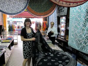 Although my dear friend, Laura, only had a couple of days to spend with me in Singapore, we had time to go shopping! As quilters, we naturally love to see textiles and fabrics in any city that we visit. We made our way down to Arab Street. You can find a wonderful selection of fabrics, carpets, baskets, and all sorts of goods.