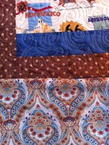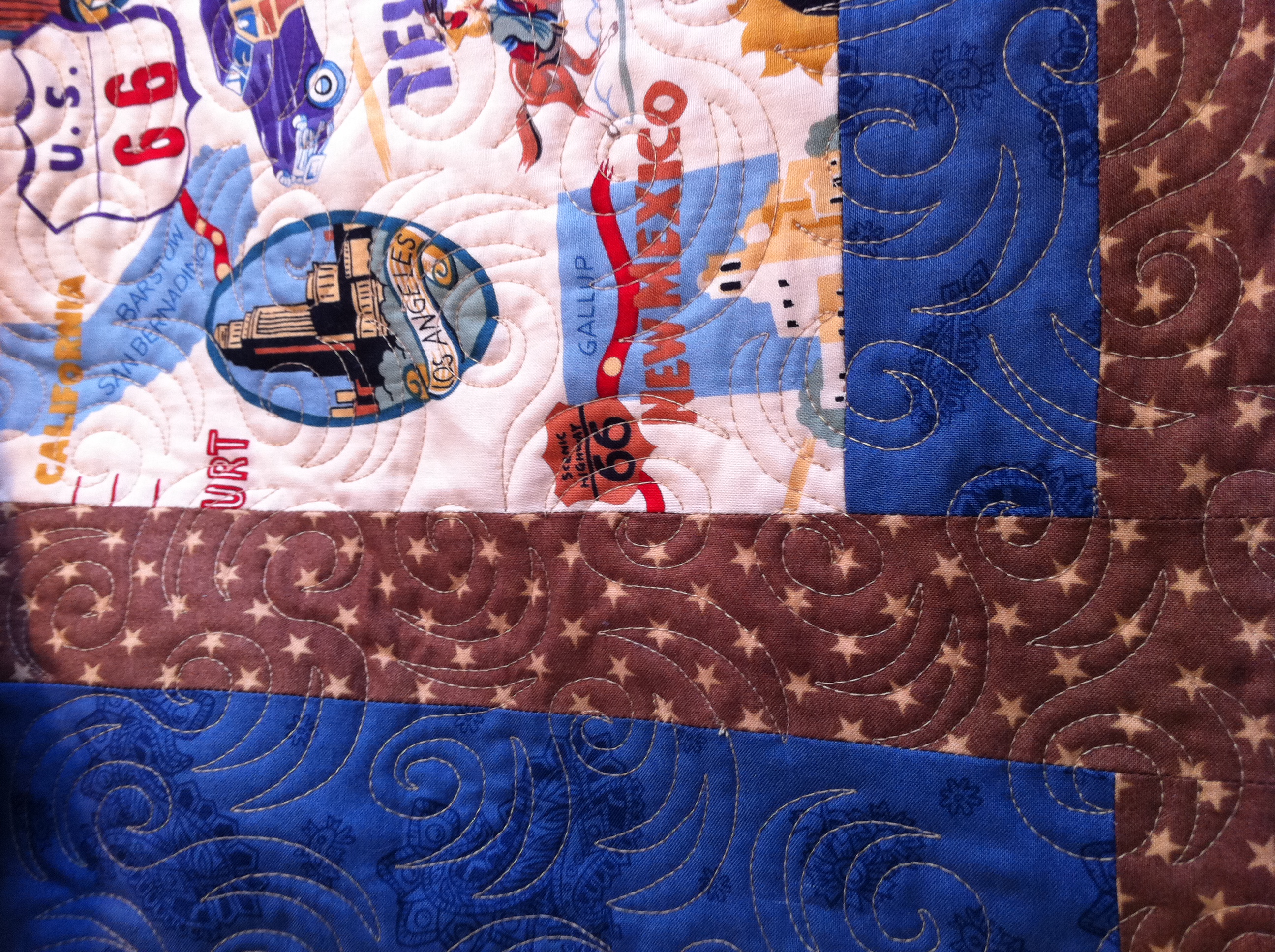 Well, I have started machine quilting my daughter Sarah’s Route 66 commemorative quilt. You may recall from a prior post – Route 66 Quilt, I made two quilts, to commemorate our journey in July of 2010. My daughter and I drove my car from San Francisco to Los Angeles where we picked up Route 66, and followed it through Arizona, New Mexico, Texas, and Oklahoma. We wanted to see all the amazing, kitschy tourist sites, such as the giant dinosaur park, the Wigwam Motel, Cadillac Ranch, and other fantastic sites. It was the trip of a lifetime.