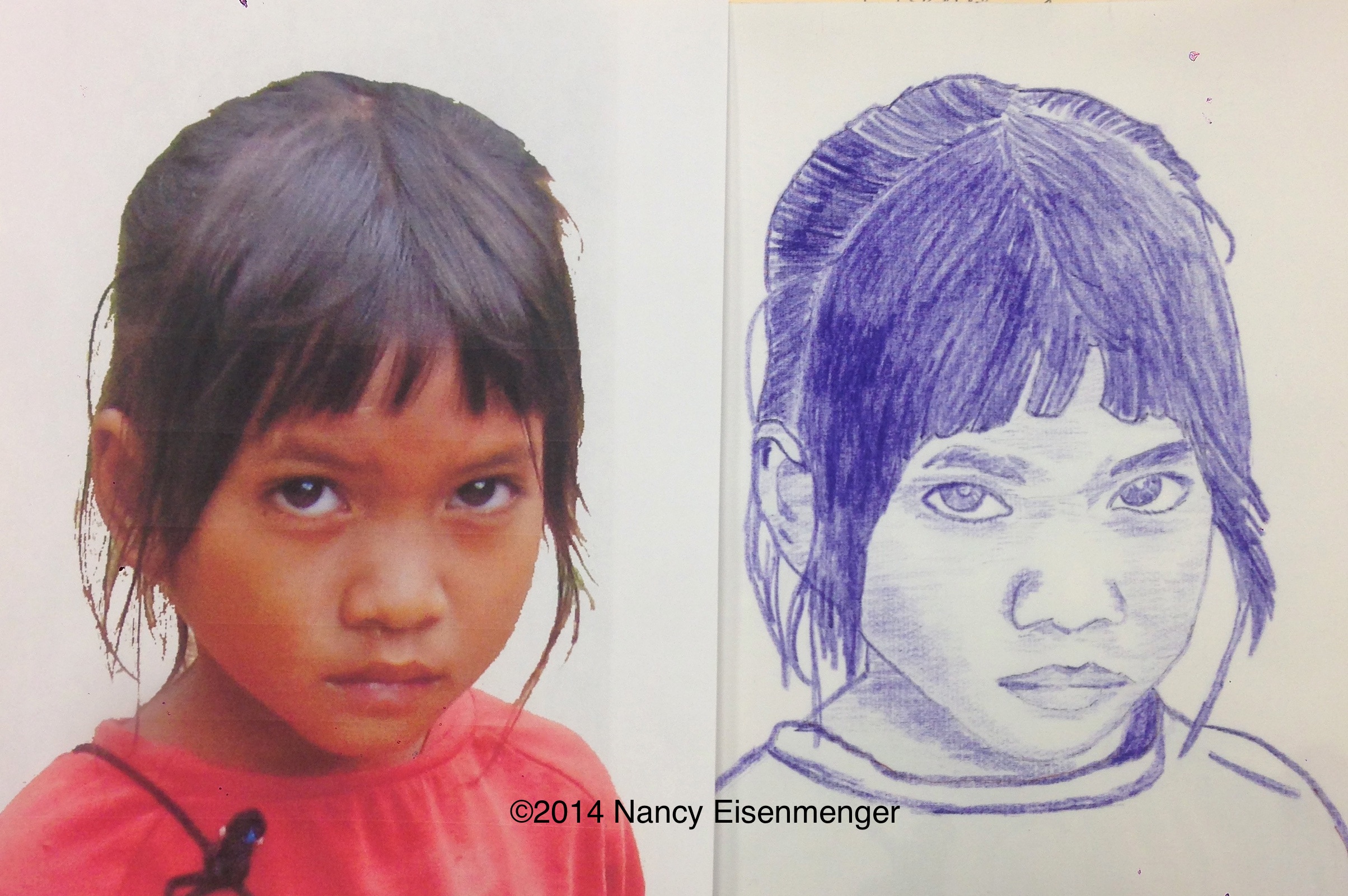 The workshop was fantastic. We began with a personal photo that had a face filling the entire photo frame, or detailed enough to enlarge and print on a letter sized fabric sheet. I used a photo of a little girl outside of a temple in Cambodia. The picture on the left shows the printed picture, and the right, my drawn image. I used a purple crayon to create the image.