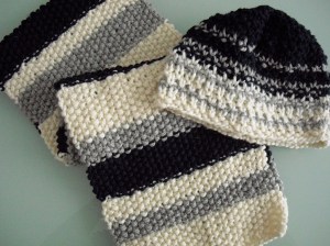 I have made two of these hats and scarves, one for each of my daughters. This is Sarah’s version. She wanted the gray, navy and white colors. I am taking it back to the States when I go to visit at Thanksgiving. I hope it will keep her warm and cozy on those cold New York days and nights.