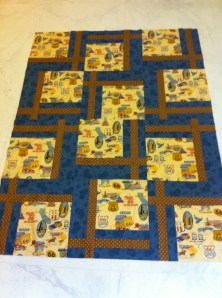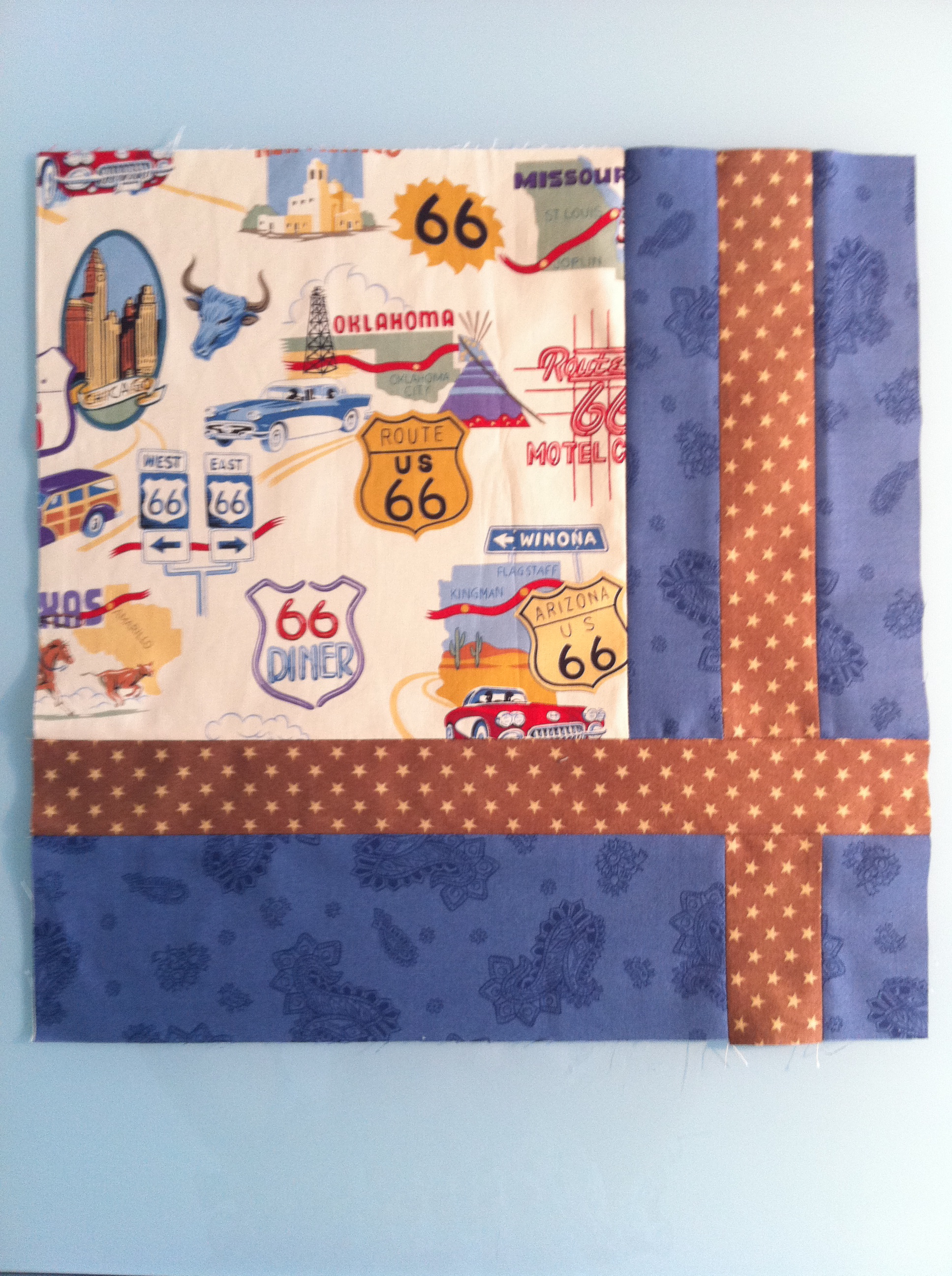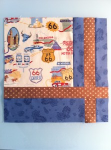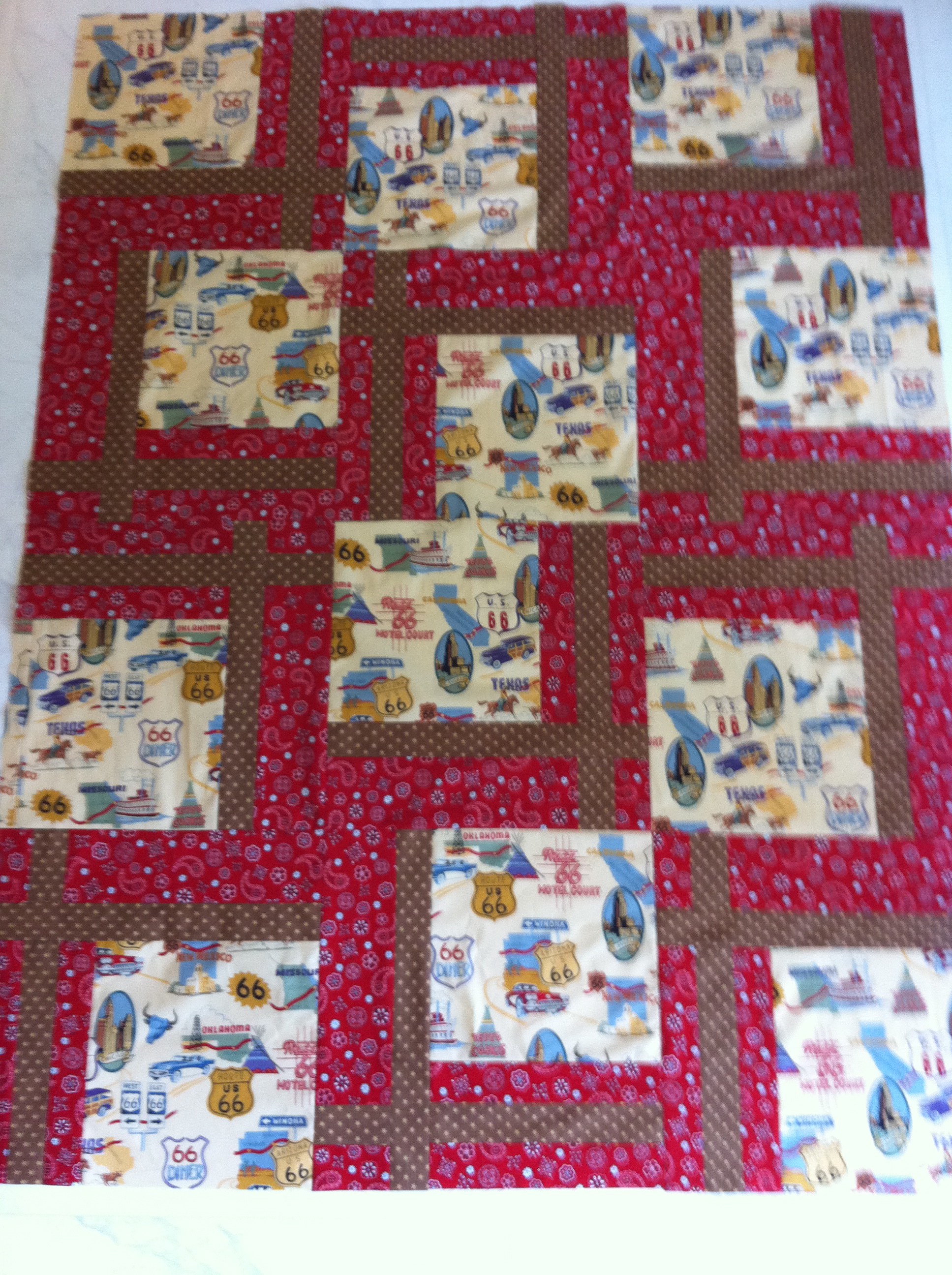 As, we were driving through Williams, Arizona, I decided to check out a quilt store there. First off, Williams was such a cute town. It is near the Grand Canyon, and many people stop there as a jumping off point to tour the canyon. The shop was called Quilters Mercantile on Route 66. Be sure to look at their website, it is an adorable store, and the people were so friendly and helpful. I found some Route 66 fabric, and decided I had to do two quilts to commemorate our cross-country journey. I haven’t decided which one I will give to Sarah, and which one I will keep though. I have to buy some backing fabric, and then quilt them. I thought I would quilt them when I head back to the states at Thanksgiving time. I used the BQ2 pattern, from Maple Island Quilts which is an excellent choice, especially if you want to showcase some fabrics.